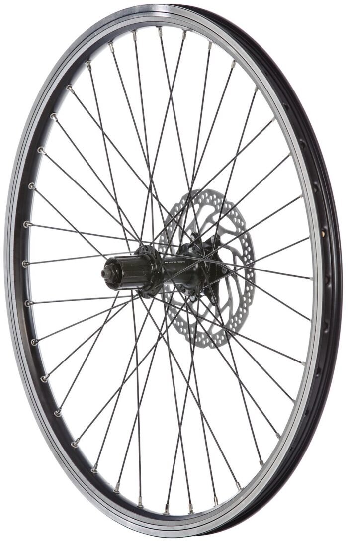 Dubbelbottnad 36 håls fälg, nav för 8/9 delad kassett och 160 mm bromsskiva med axel för snabbkoppling, ekerlängd: 234 mm