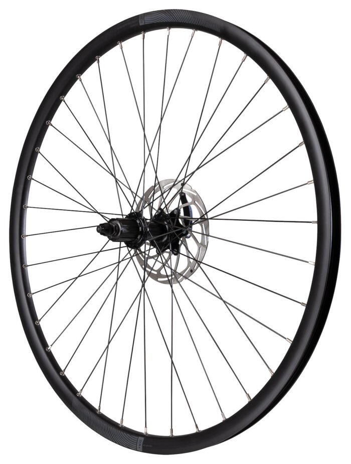 Dubbelbottnad 36 håls fälg, nav för 8/9 delad kassett och 160 mm bromsskiva med axel för snabbkoppling, ekerlängd: 285 mm